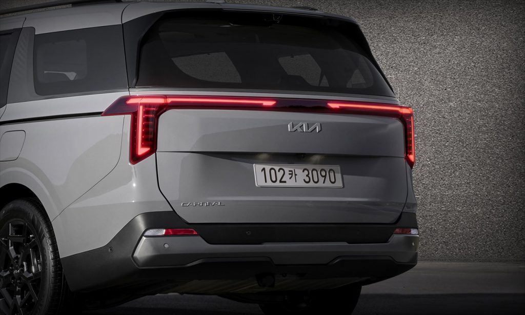 A minivan premium de 8 lugares da Kia traz design traseiro robusto e elegante com lanternas sofisticadas também na parte de trás do veículo.