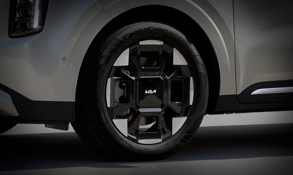 As rodas de liga leve aro 19″ com acabamento diamantado e pneus 235/55R19 complementam as linhas dinâmicas da Carnival.