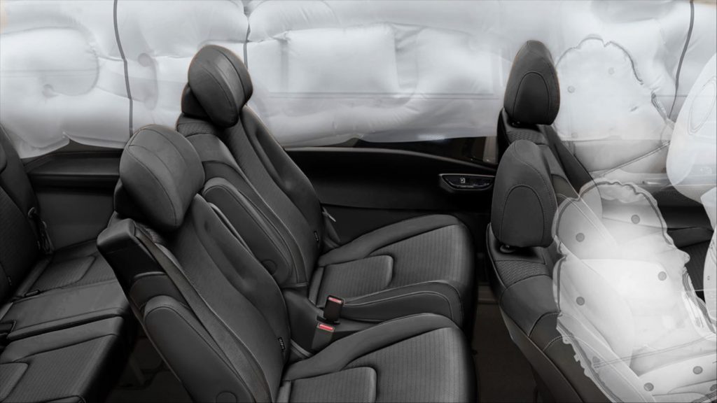 Para oferecer máxima proteção a todos os passageiros em caso de colisão, a Kia Carnival possui airbags frontais duplos, laterais e central dianteiros e de cortina que protegem as três fileiras de assentos, além de airbag de joelho para o motorista.