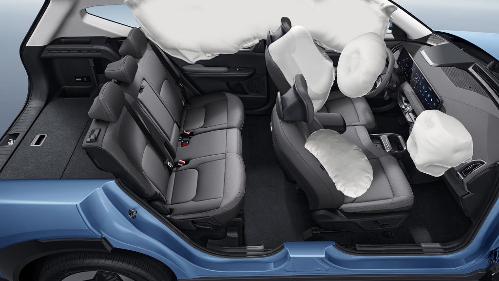 Para oferecer máxima proteção a todos os ocupantes em caso de colisão, o Kia EV5 possui airbags frontais duplos, laterais dianteiros e de cortina que protegem as duas fileiras de assentos.