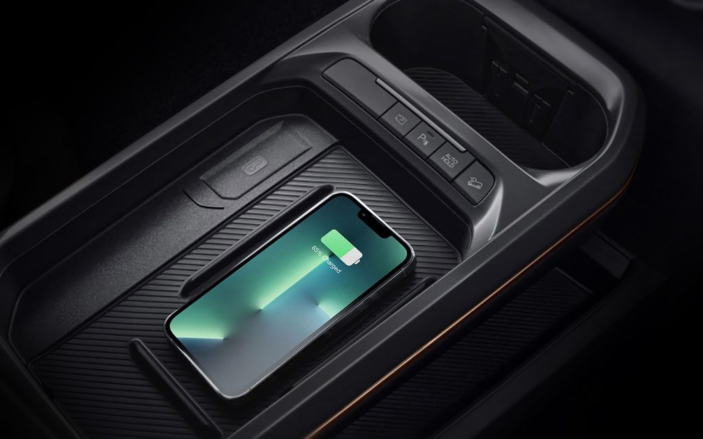 Para celulares que possuem a tecnologia de carregamento sem fio, o novo Kia EV5 conta com carregador wireless por indução. Basta posicionar o aparelho celular compatível para recarregar a bateria, sem a necessidade de conectar qualquer cabo.