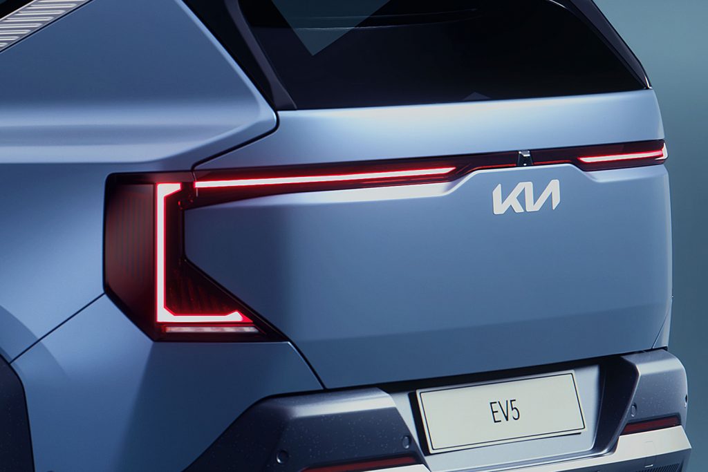 O design sólido, robusto e sofisticado do Kia EV5 também se manifesta na lanterna traseira em LED que envolve a carroceria e realça uma forma de escultura forte e digital, transmitindo a sensação de proteção e segurança.