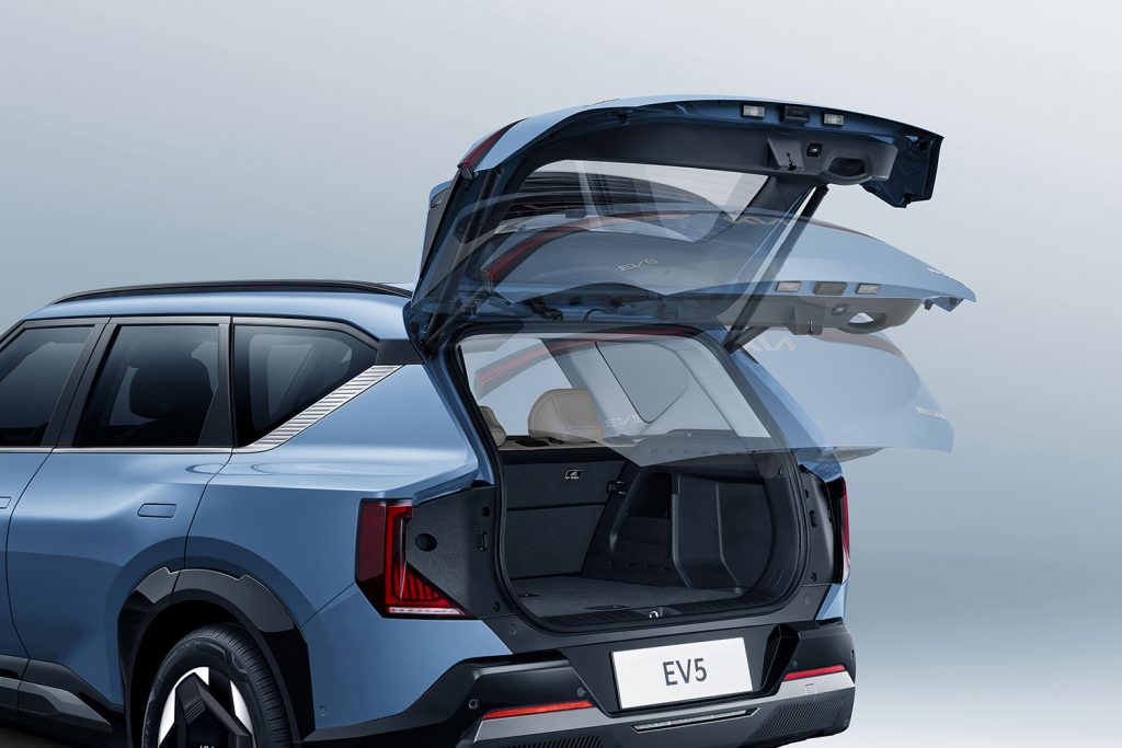 O Kia EV5 conta com tampa do porta-malas com acionamento elétrico e abertura programável (Smart Tailgate) pela chave inteligente (Smart Key).